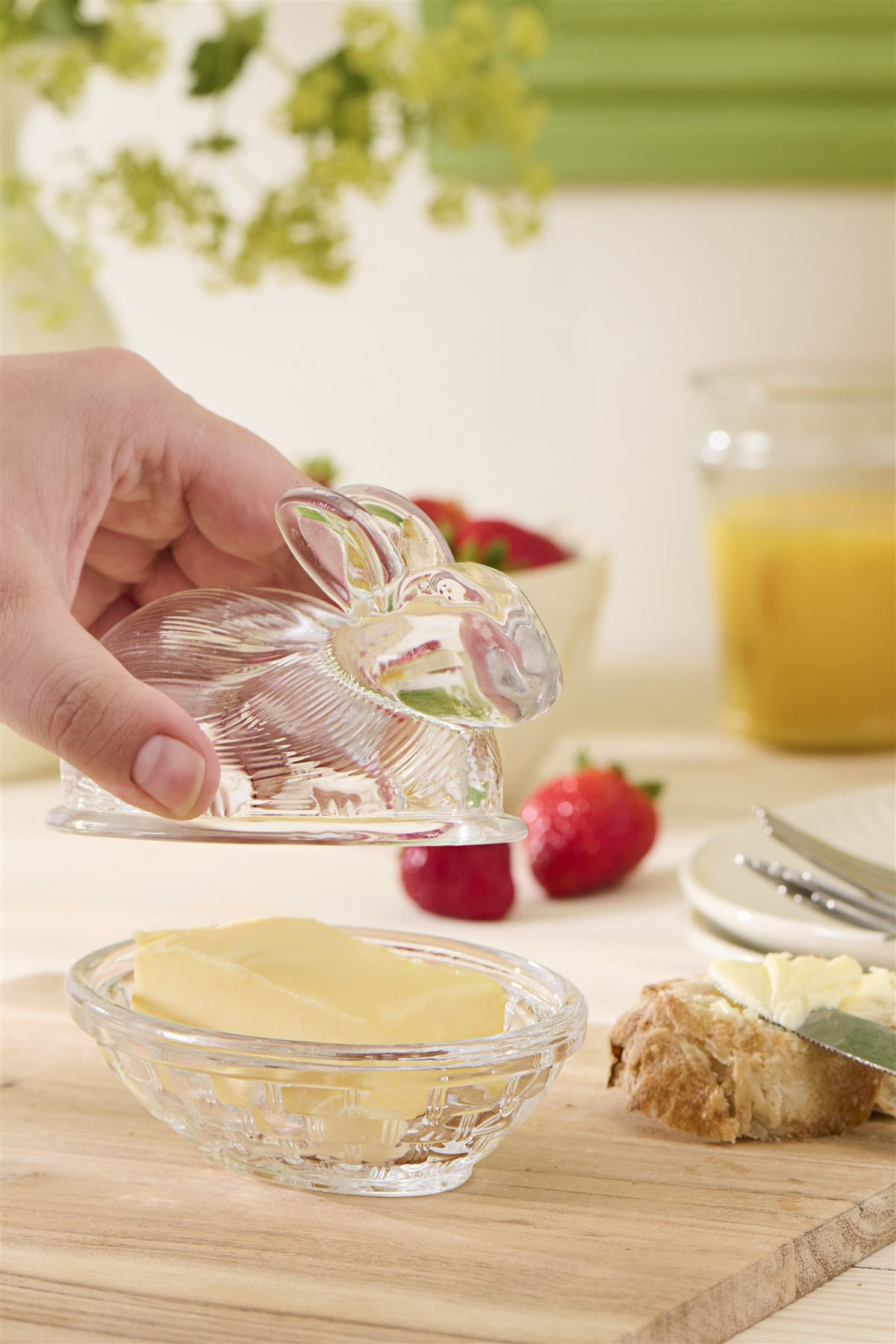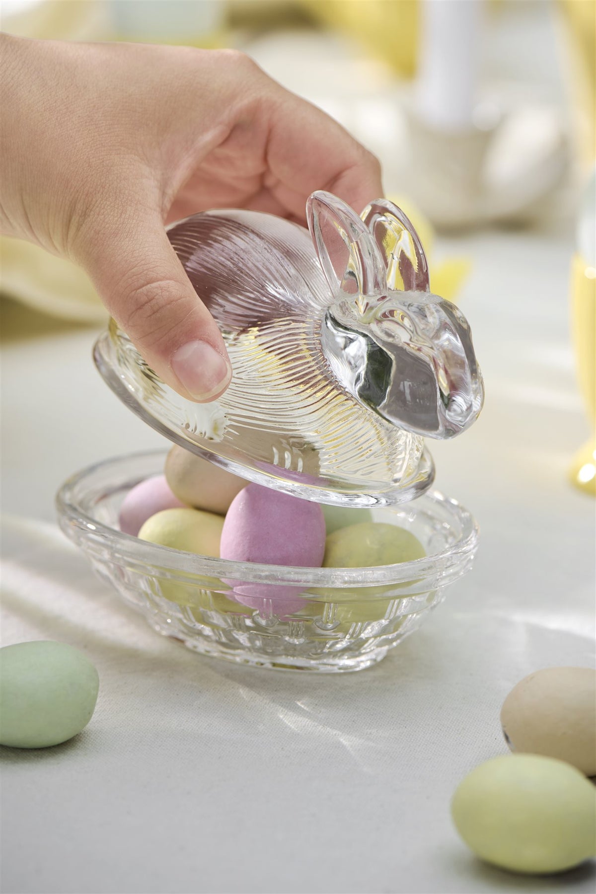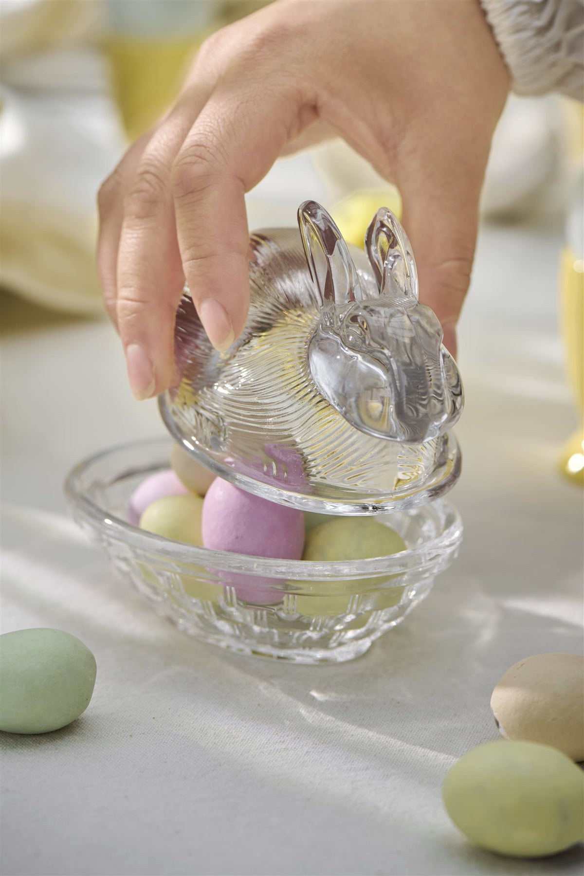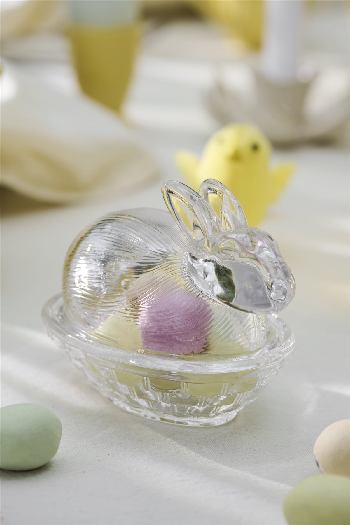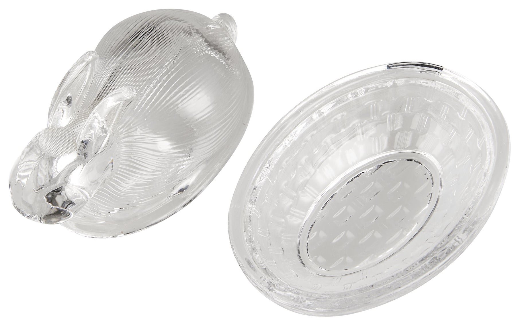Schattig glazen schaaltje met een deksel in de vorm van een haasje. Leuk om paaseitjes in te bewaren of om boter te serveren.