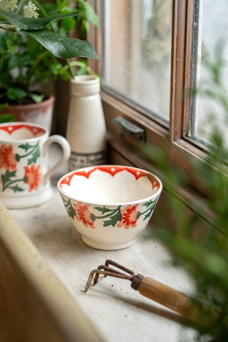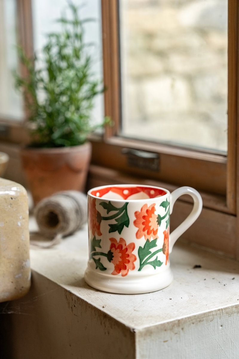 De klassieke half pint mok van Emma Bridgewater met de print Chrysanthemum. Alle items van Emma Bridgewater worden met de hand gemaakt in Stoke-on-Trent in Engeland. Deze mok is met de hand bestempeld. Daarvoor wordt een sponsje in de juiste vorm gesneden, waarna het in de verf wordt gedoopt om de print op de mok te drukken. Zo bijzonder! Ieder item is uniek.