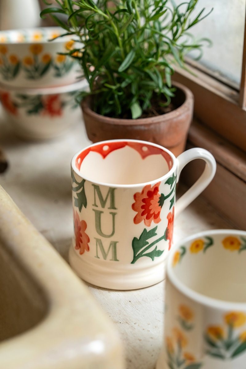 De klassieke half pint mok van Emma Bridgewater met de print Chrysanthemum en de tekst MUM. Alle items van Emma Bridgewater worden met de hand gemaakt in Stoke-on-Trent in Engeland. Deze mok is met de hand bestempeld. Daarvoor wordt een sponsje in de juiste vorm gesneden, waarna het in de verf wordt gedoopt om de print op de mok te drukken. Zo bijzonder! Ieder item is uniek.