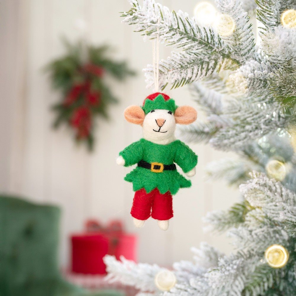 Vilten hanger in de vorm van een muis verkleed als kerstelf, met groene tuniek en puntmuts. Dankzij het touwtje hang je hem eenvoudig in de kerstboom. Een vrolijke en originele toevoeging voor de feestdagen.