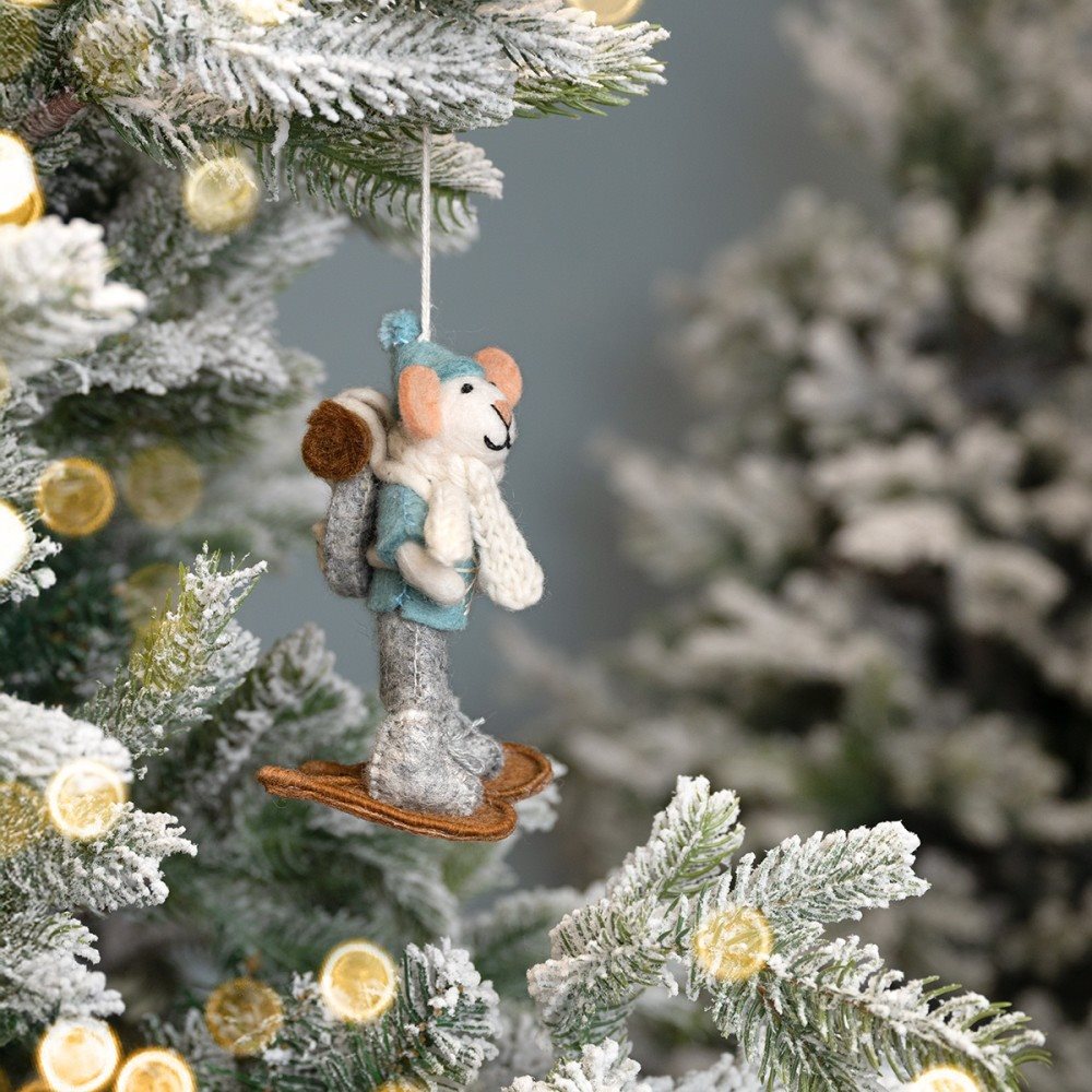 Een vilten sneeuwmuis met een ijsblauwe trui, een warme sjaal en een rugzak. Klaar voor een winterse wandeling op sneeuwschoenen. Een sfeervolle hanger voor in de kerstboom of als decoratie in huis.