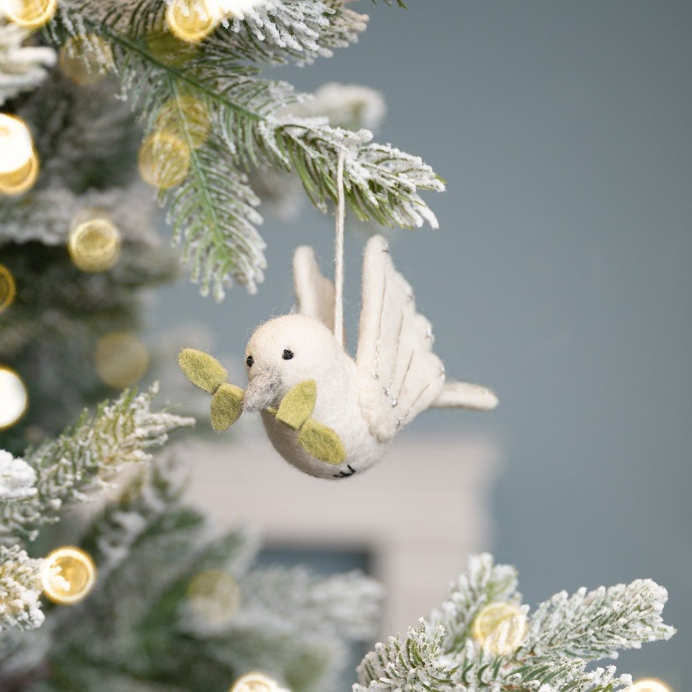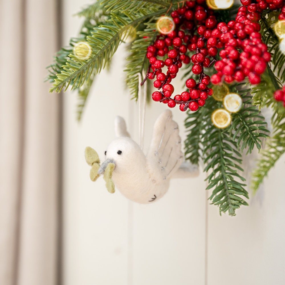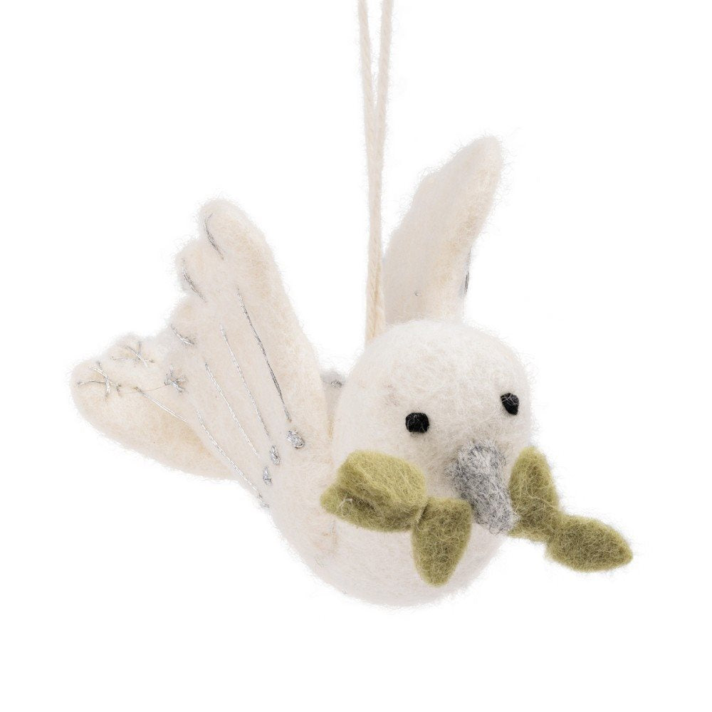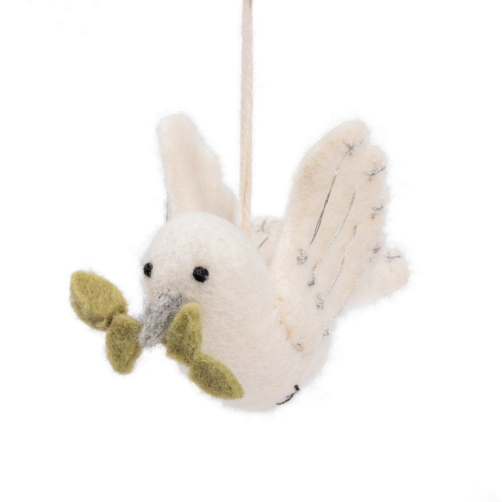 Vilten vredesduif met zilveren details en een olijftakje in de snavel. Een symbool van hoop en vrede, perfect om op te hangen in huis. Een subtiele en betekenisvolle decoratie voor ieder seizoen.