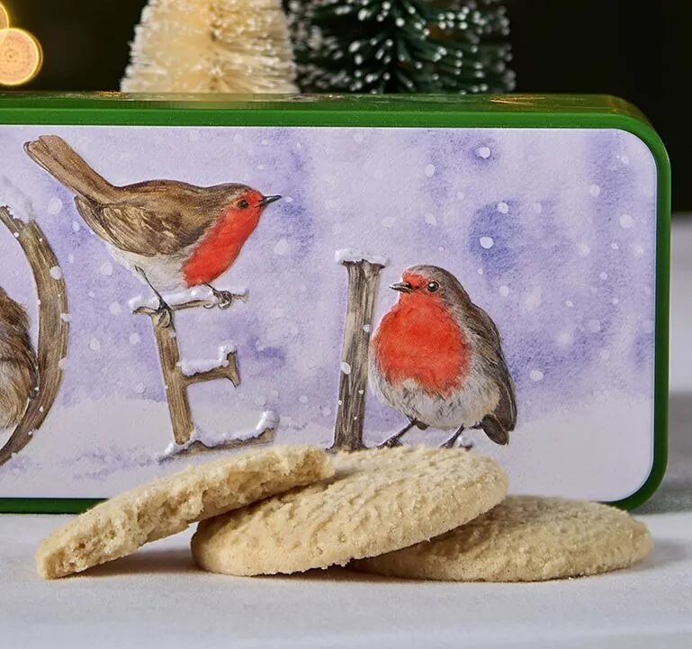 Prachtig blik met roodborstjes en de tekst 'Noël'. Gevuld met clotted cream koekjes.