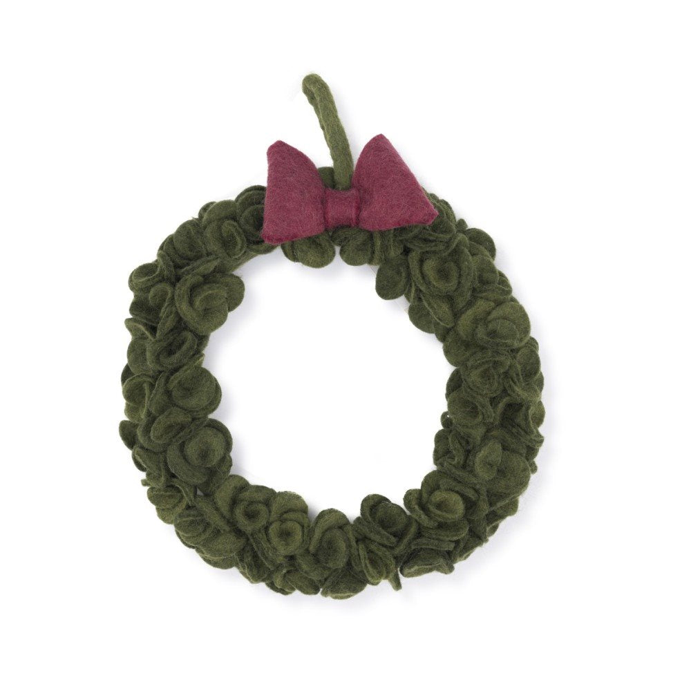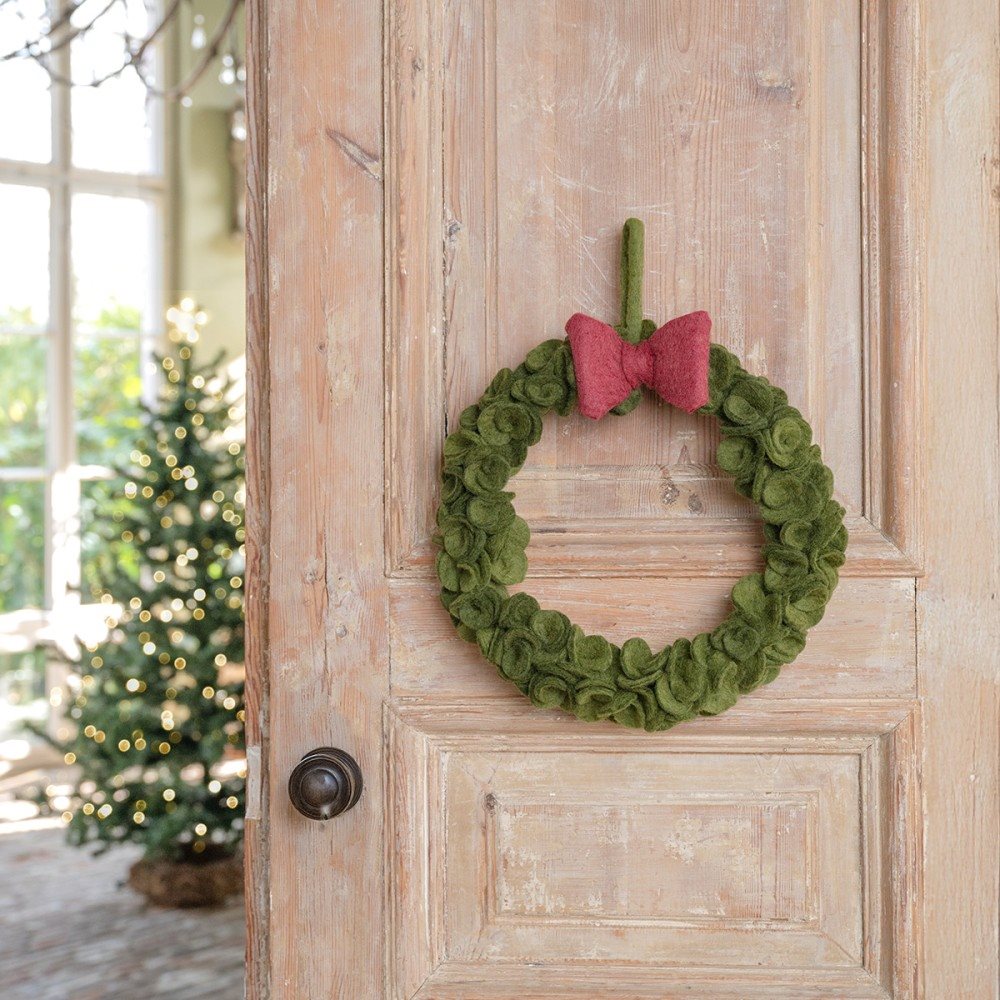 Vilten krans in diepe groentinten, geïnspireerd op eucalyptus, met een stijlvolle rode strik. Een sfeervolle decoratie voor de feestdagen, perfect voor aan de deur, muur of als tafeldecoratie. Brengt een warme en klassieke kerstsfeer in huis.