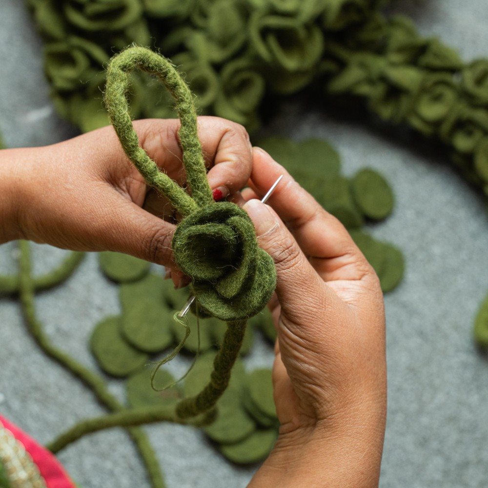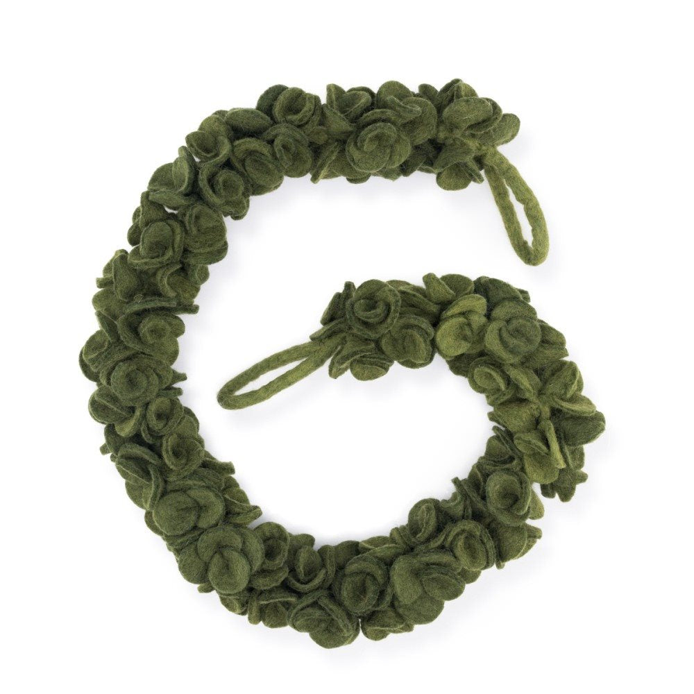Een sfeervolle viltslinger geïnspireerd op eucalyptus, uitgevoerd in diep donkergroen. De met de hand gevormde vilten blaadjes geven deze guirlande een natuurlijke uitstraling, perfect om een interieur te verrijken met subtiele botanische details. Mooi te draperen langs een schouw, deurpost of feesttafel en een prachtig alternatief voor traditionele groenversiering.