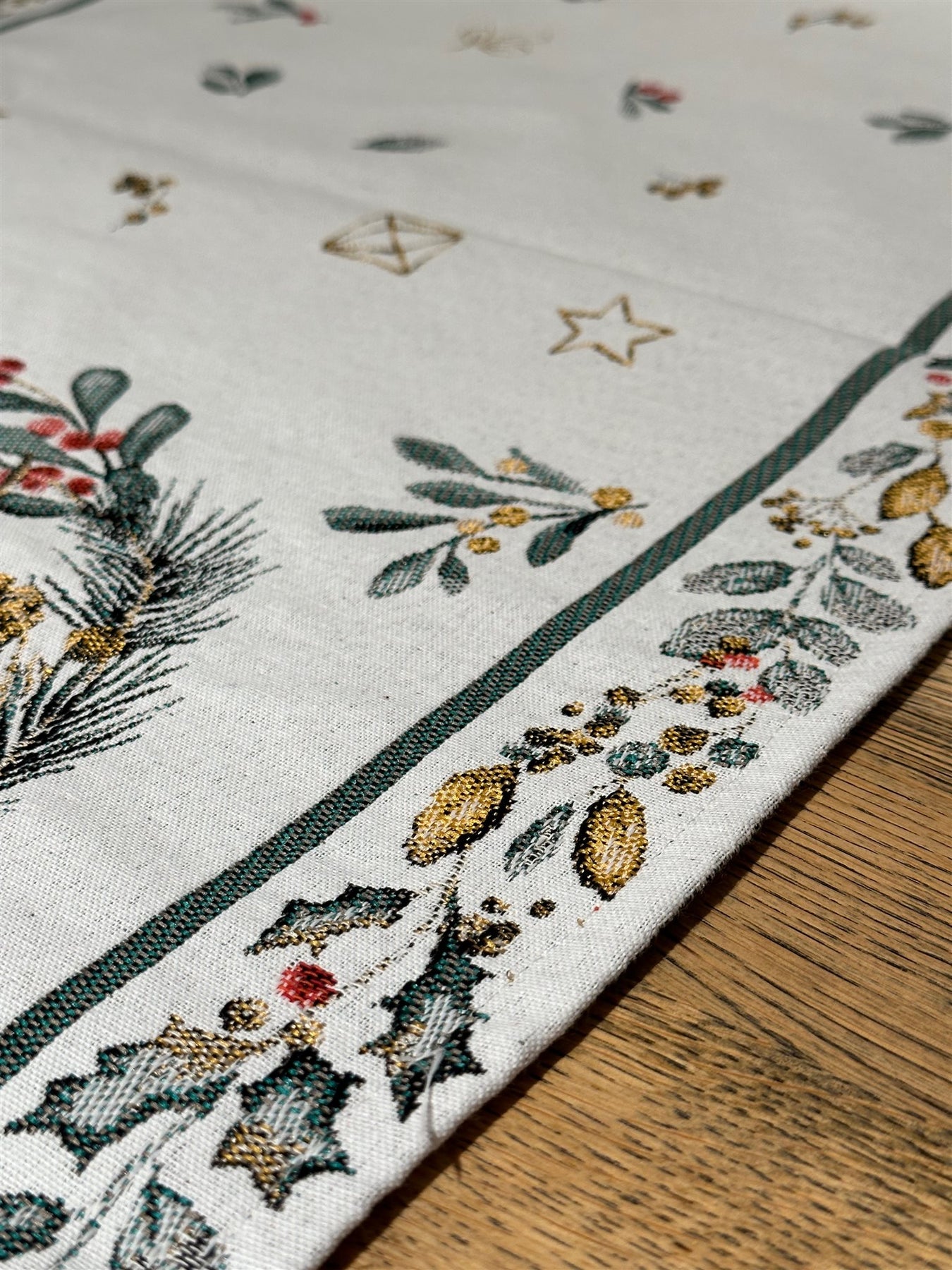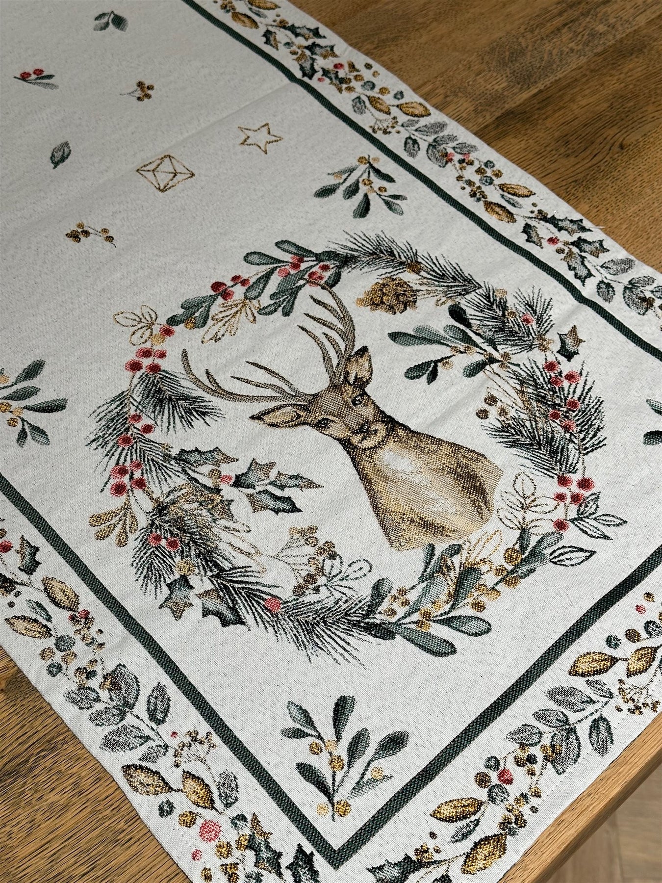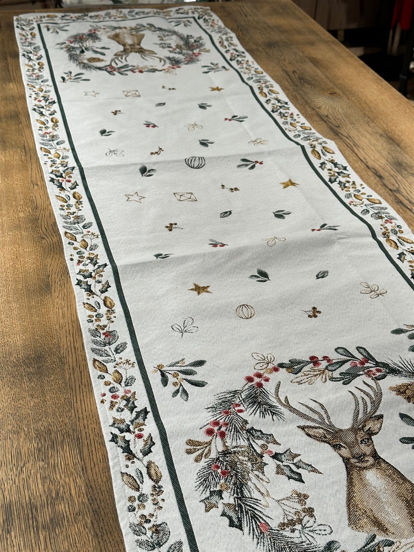 Winterse tafelloper van hoogwaardige jacquard kwaliteit van het Duitse merk Sander. Deze mooie loper zit vol met details en goudweefsel. 70% acryl, 30% katoen.