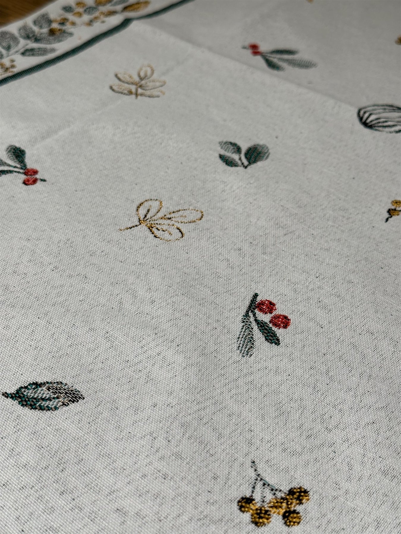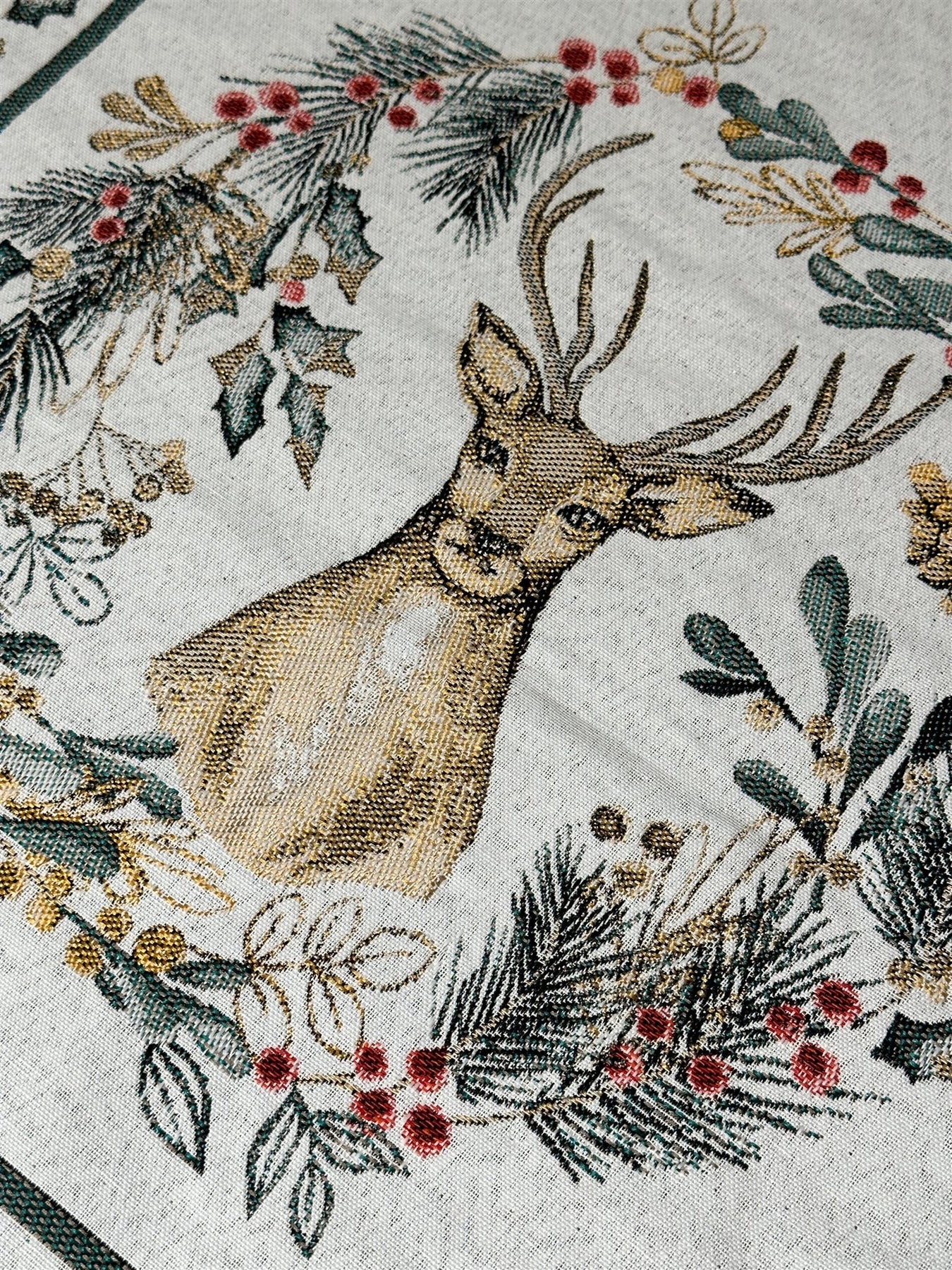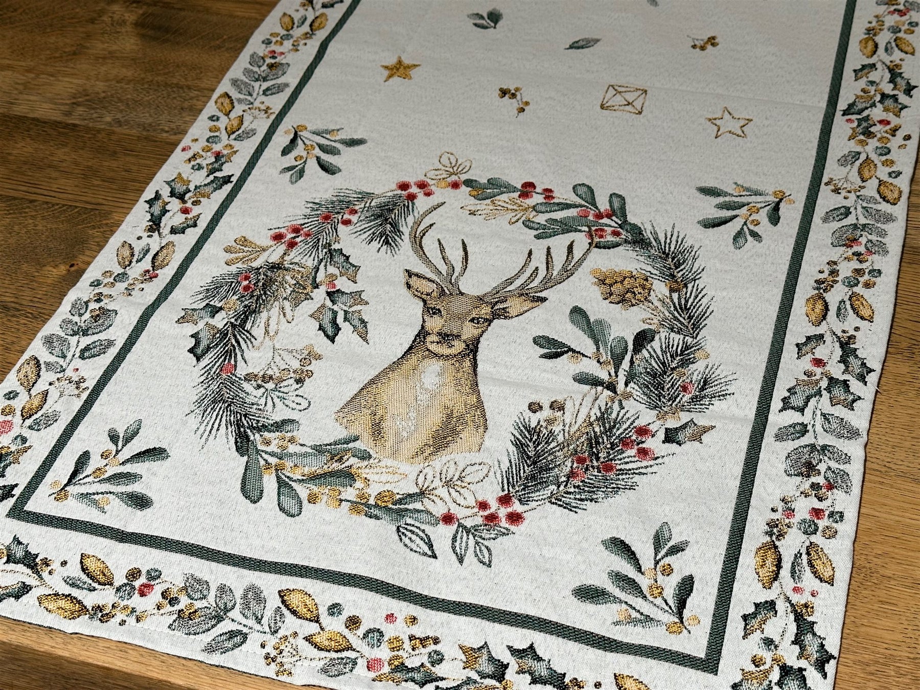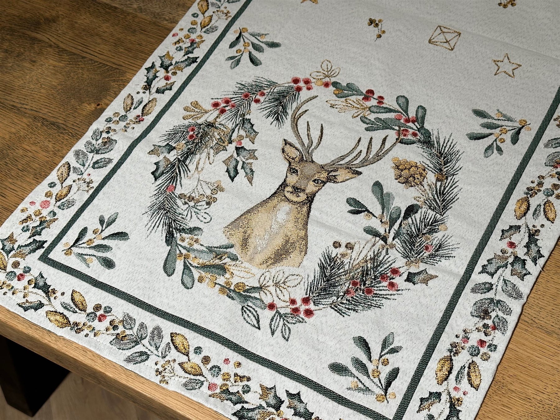 Winterse tafelloper van hoogwaardige jacquard kwaliteit van het Duitse merk Sander. Deze mooie loper zit vol met details en goudweefsel. 70% acryl, 30% katoen.