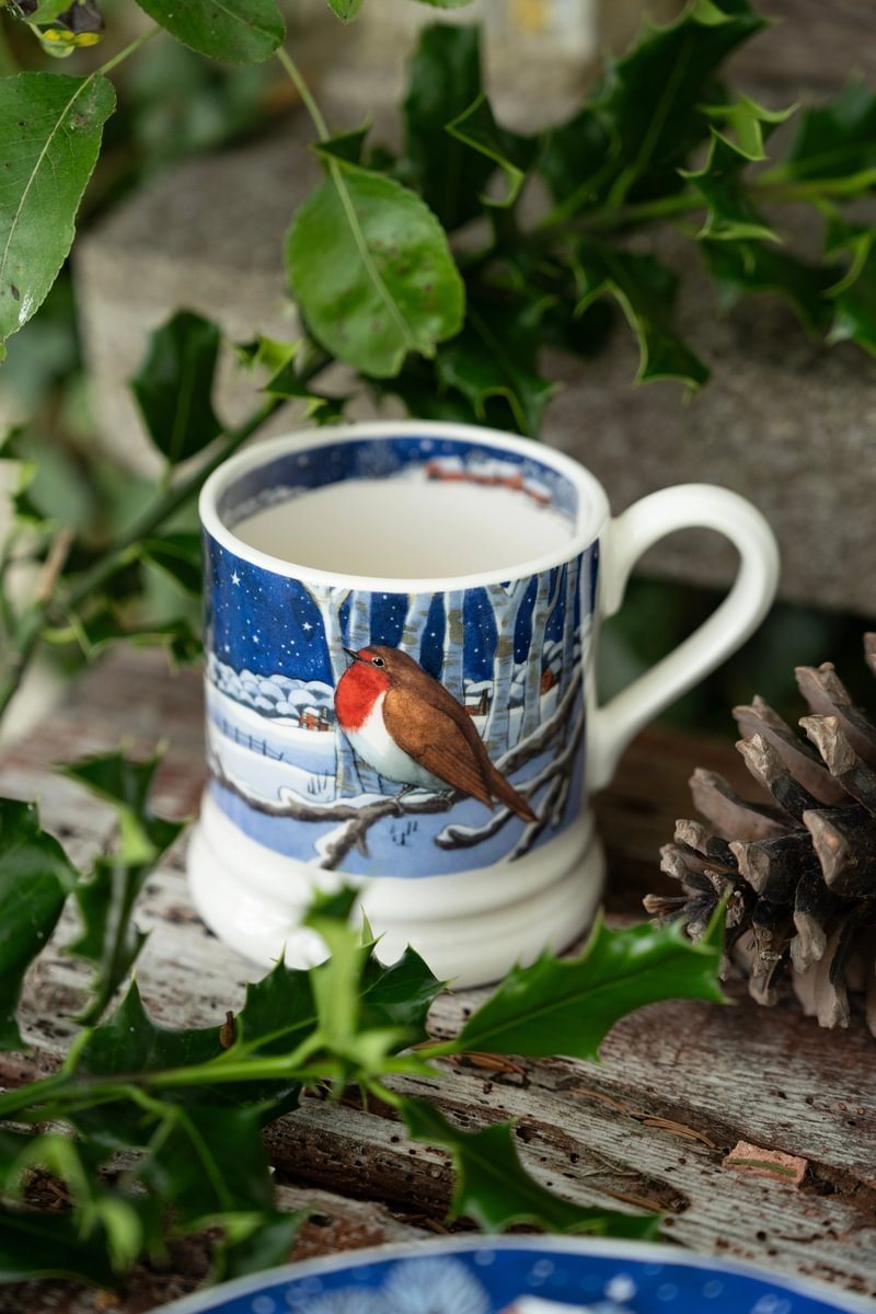 Mok met een afbeelding van een roodborstje in een prachtig winters landschap. Alle items van Emma Bridgewater worden met de hand gemaakt in Stoke-on-Trent in Engeland.