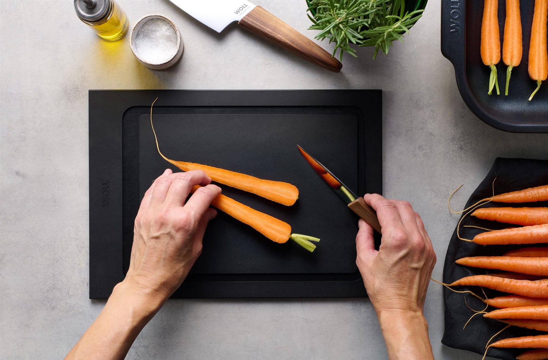 Nieuw van het degelijke Duitse merk Woll, bekend van de pannen: duurzame snijplanken. Gemaakt van FSC-gecertificeerd papiercomposietmateriaal, zijn de planken verkrijgbaar in verschillende maten en designs. Ze zijn allemaal zacht voor messen, vaatwasserbestendig en niet-poreus, dus ze nemen geen geuren op of verkleuren niet. Elke plank heeft ook vier stevige siliconen voetjes om een ??veilige stand te garanderen. De snijplanken van Woll zijn BPA-vrij.