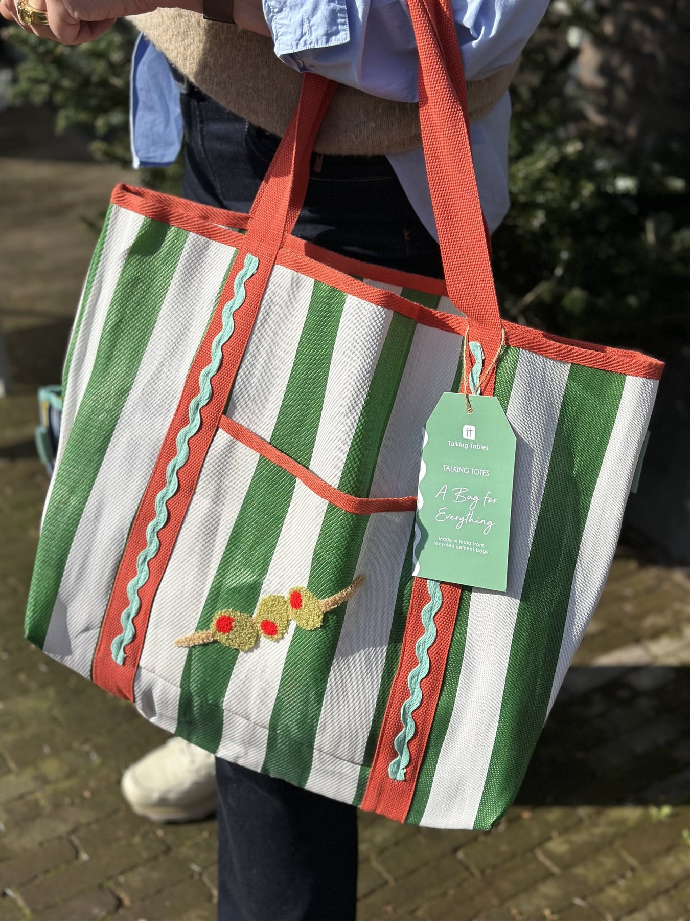 Deze kleurig tas is geweldig! Gemaakt van gerecyclede cementzakken, in leuke kleurcombinaties. Met een borduursel van olijven. 46,5 cm x 39 cm