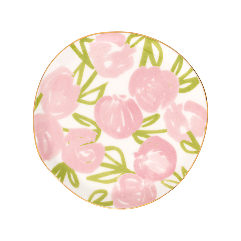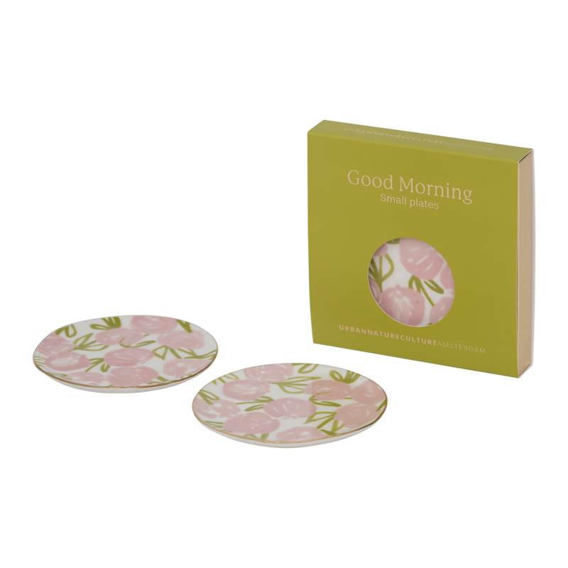 Set van 2 Good Morning plates, gebaksbordjes met gouden rand en bloemen.