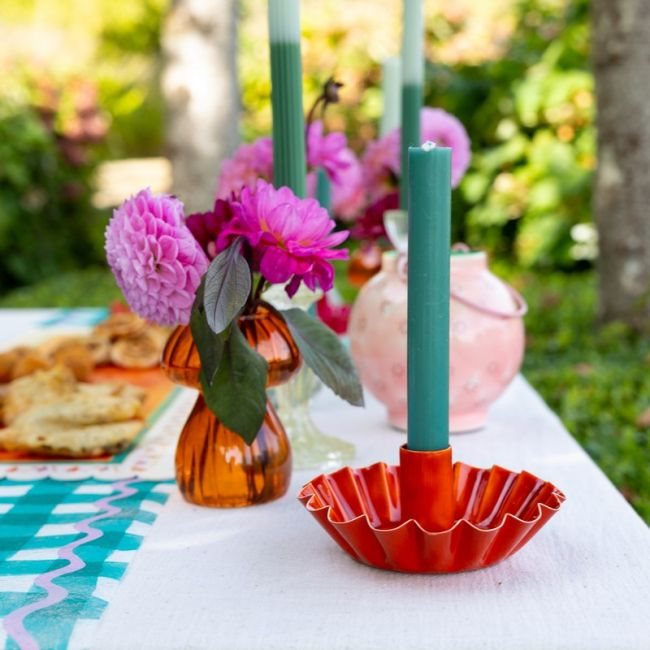 Emaille kandelaar met geschulpte rand. De gekleurde dinerkaarsen op onze webshop passen hier precies in. 14 x 5 cm